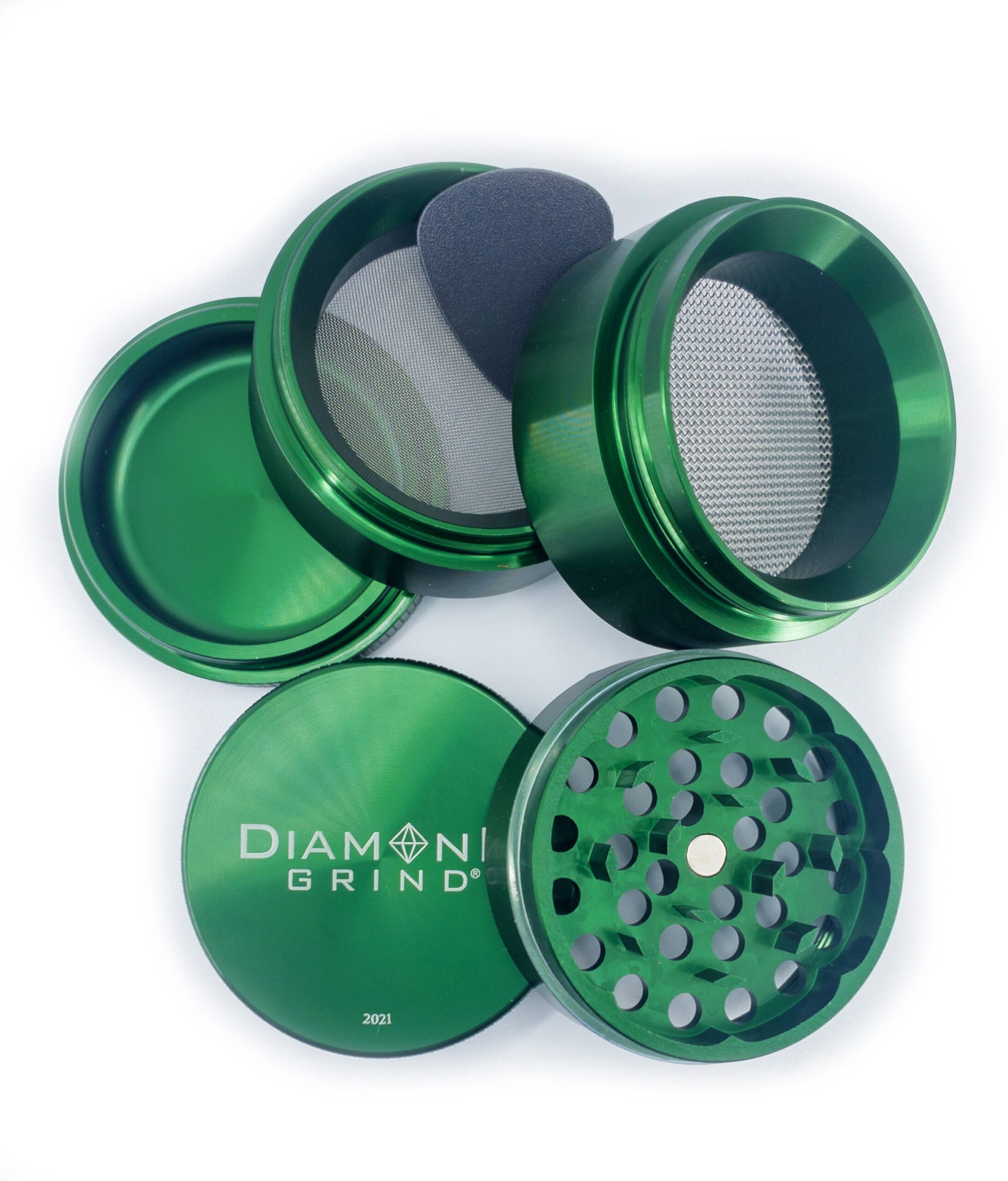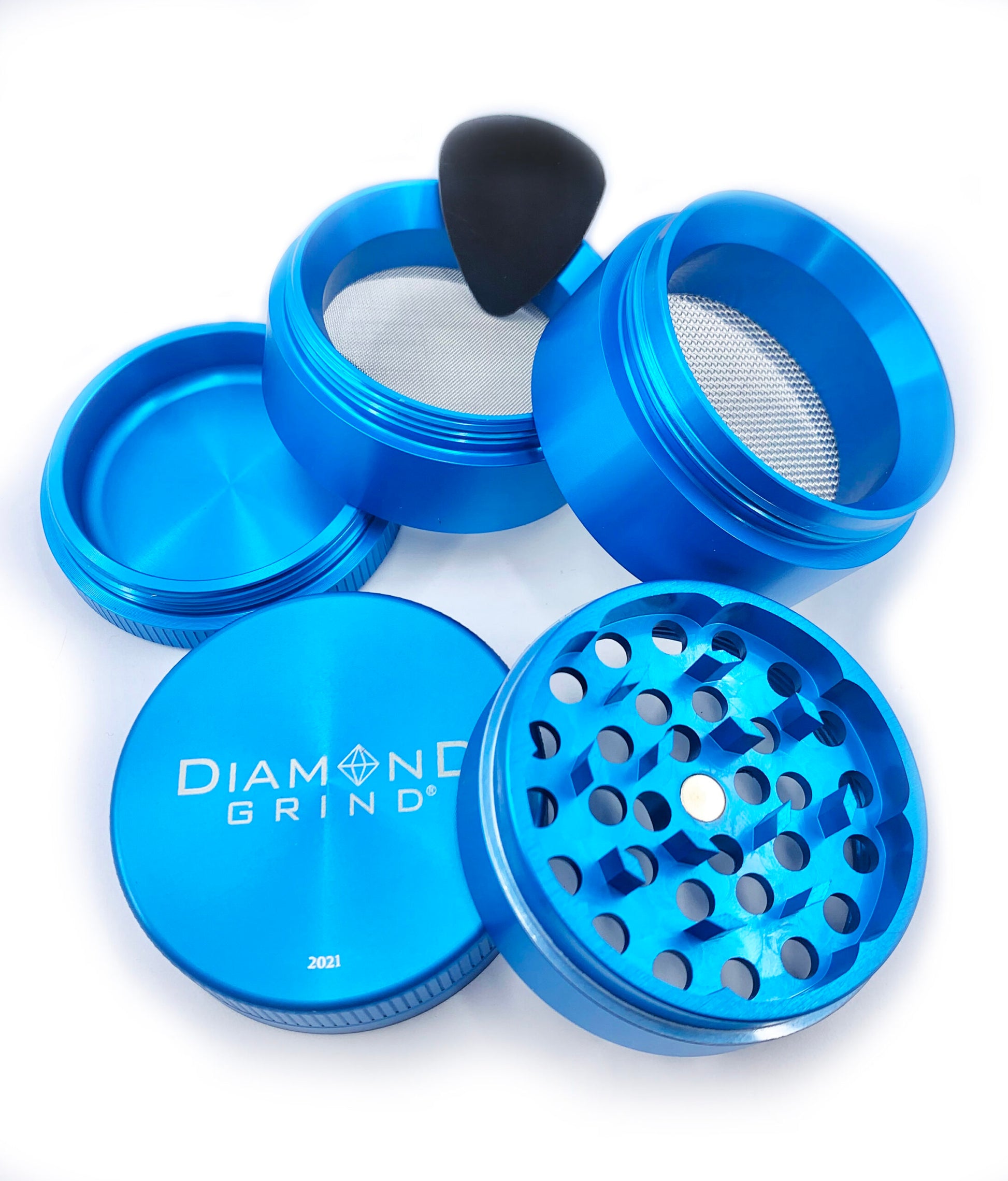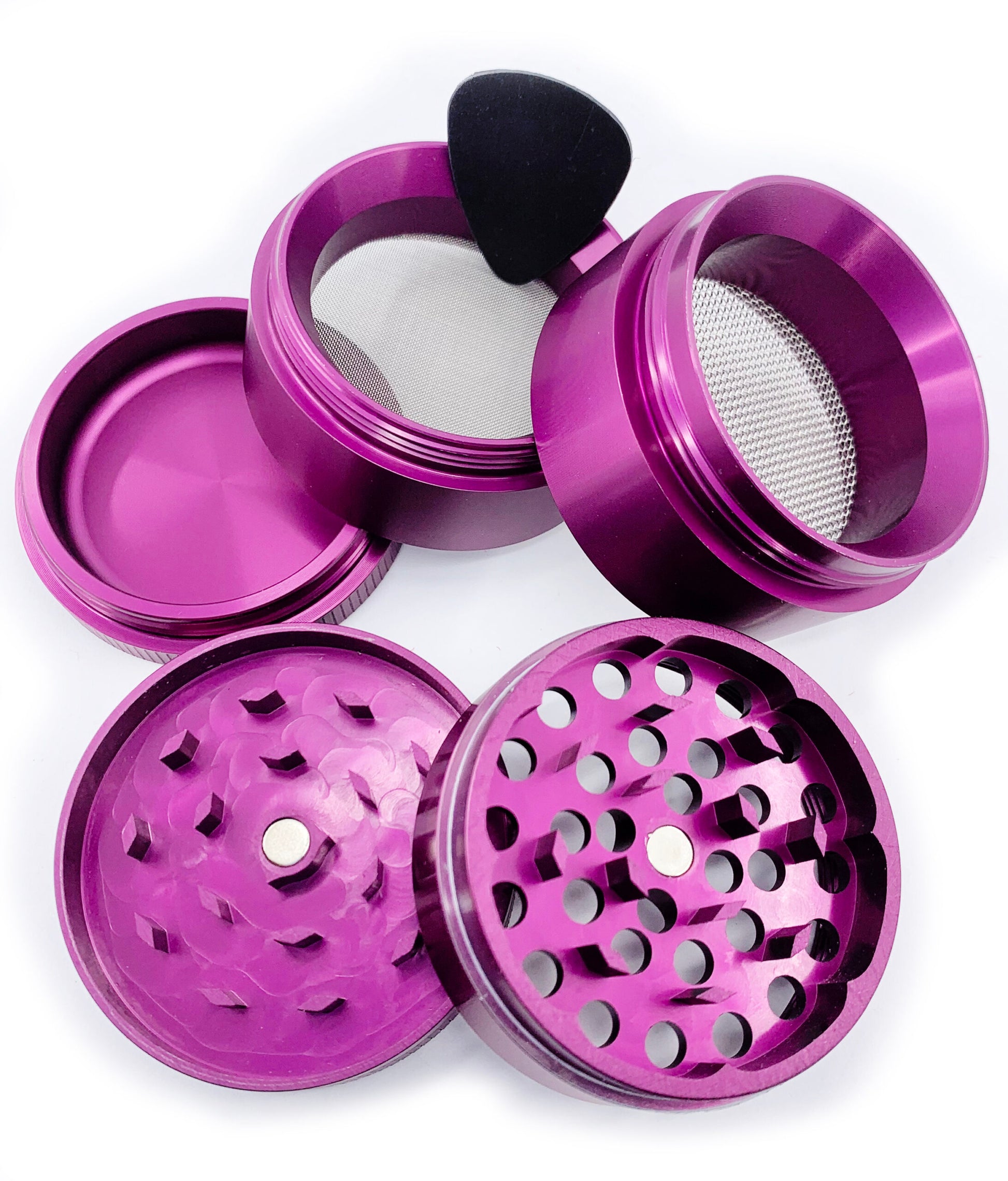 These are 5 piece grinders with a super strong magnet and 2 screens. Made from CNC aircraft grade Aluminum. Available in 3 sizes
